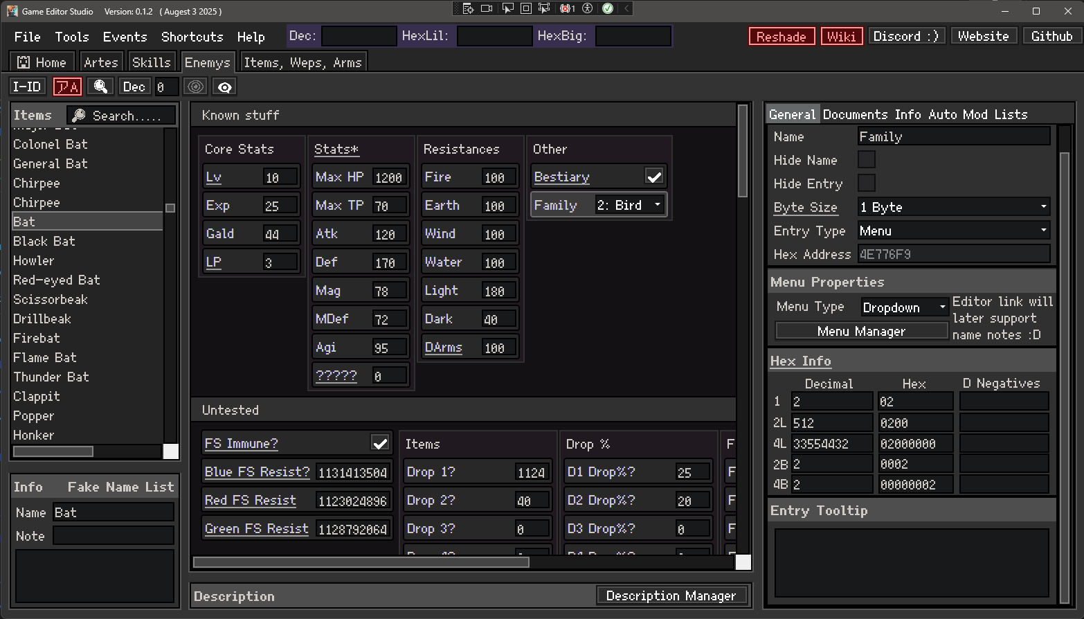 - Each table byte is represented as an "Entry" (Max HP, Str, Gold, etc).